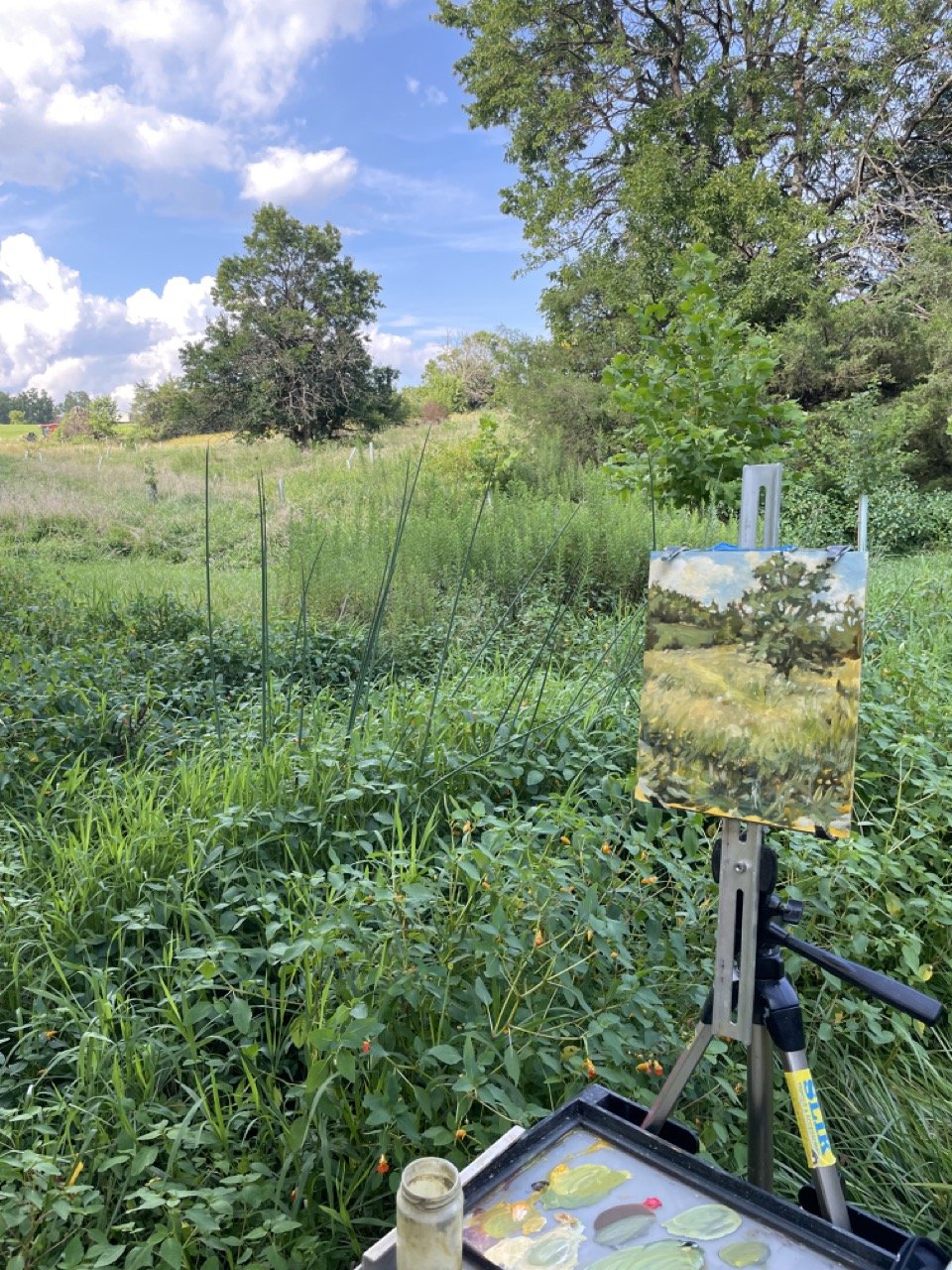 I painted from 6-7:30 pm. It’s 81 degrees, birds are singing and crickets are chirping. We are in a measurable drought. Wind 2mph. 66% humidity. The dew point is 69 degrees. Air pressure rising. New moon. 19 miles visibility. Heard a dove, cardinal, saw a goldfinch, barn swallow and mockingbird. This was my first painting outside, and I’m going to attempt to do a whole year of painting outside to track the weather and changes.